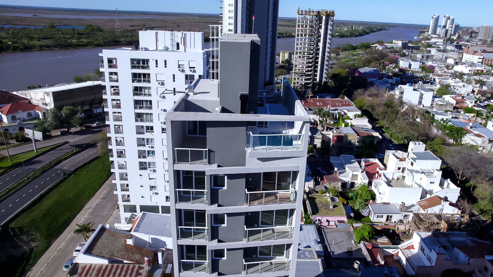El proyecto se destaca por sus inmejorables vistas hacia la costa santafesina y su extraordinaria ubicación. El mismo cuenta con subsuelo, planta baja y catorce pisos en los que se distribuyen 15 cocheras, 11 departamentos semi-pisos de 2 dormitorios, 11 departamentos semi-pisos de 1 dormitorio, un piso exclusivo de 3 dormitorios y amenities.